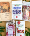 Unser Muttertagpaket: Es enthält 1x unsere eigenen gefriergetrockneten Heidelbeeren 35g, 1x Chrunchy Müsli 220g, 1x Naschitüte ( gefriergetrocknete Erdbeeren + Äpfel)15g , 1x Haferkekse mit Zimt ( Hafergut)180g , 1x Apfelringe mit schwarzem Johannisbeersirup ( Cassies Manufaktur ) 75g ,1x Holzstern rot,